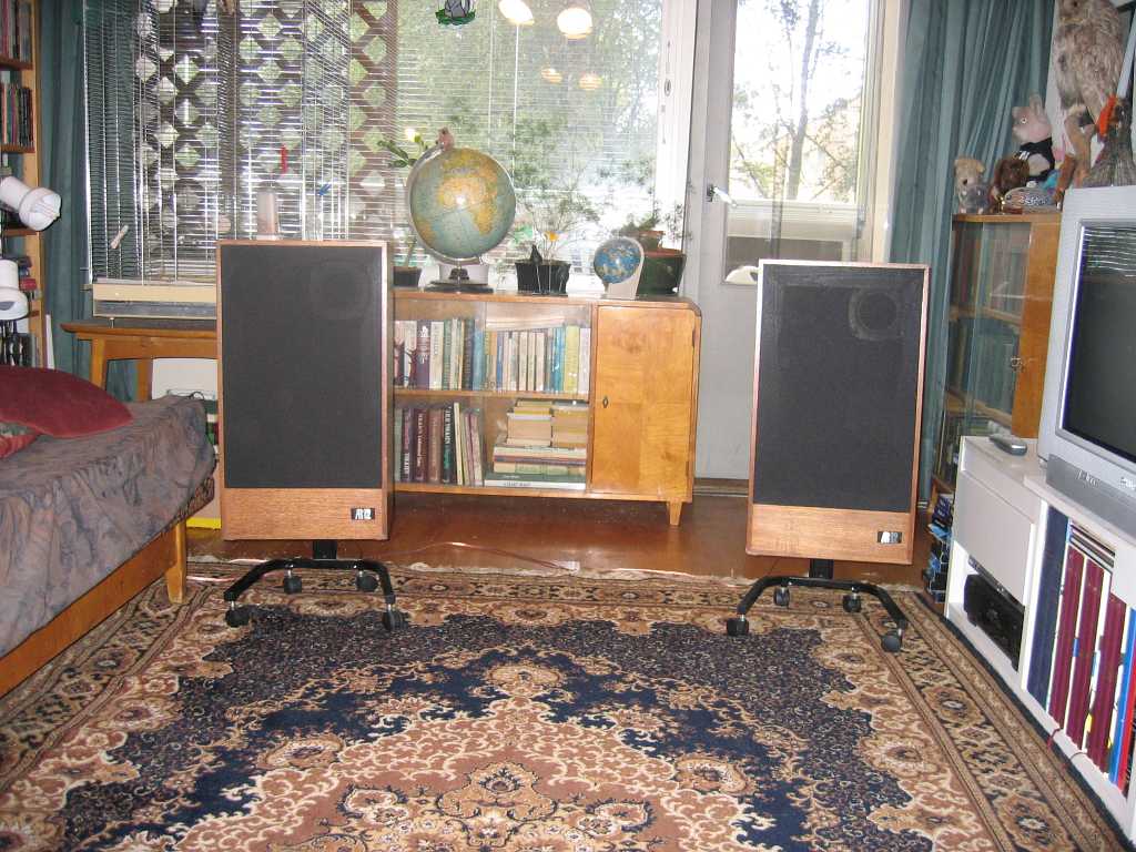Olohuoneen musiikkilaitteistoa on alettu rakentaa flat earth -filosofian pohjalta (no jaa, tosiasiassa se vain on jotenkin valunut siihen suuntaan). Huone on tyypillinen 60-luvun lähiökerrostalon olohuone mitoiltaan (pituus x leveys) 5.50 x 3.50 metriä eli 19.25 neliömetriä. Yhden lyhyen seinän muodostaa ikkuna ja parvekkeen ovi. Ikkunan alla on lasiovinen kirjahylly ja sen vieressä korkea papukaijahäkki pienellä pöydällä. Toisen lyhyen ja vasemmanpuoleisen pitkän seinän täyttää koko pituudeltaan 2.5 metriä korkea eli siis kattoon asti ulottuva kirjahylly, jossa ei ole mitään muuta kuin kirjoja. Toisen pitkän seinän täyttävät lipasto, tv-taso ja lasiovinen kirjahylly. Vapaaksi jäävää seinäpintaa peittää kymmenkunta vaihtelevan kokoista taulua lasikehyksissä.